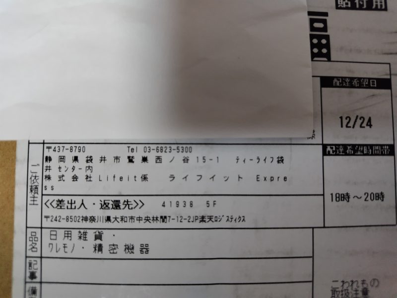 - 送り状の品名は「日用雑貨・ワレモノ・精密機器」と書かれていました。