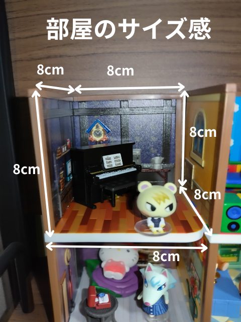 あつ森ハッピールームの1つの部屋は、たて8センチ よこ8センチ 高さ8センチの大きさのため、家具や小物がさらに小さいです。